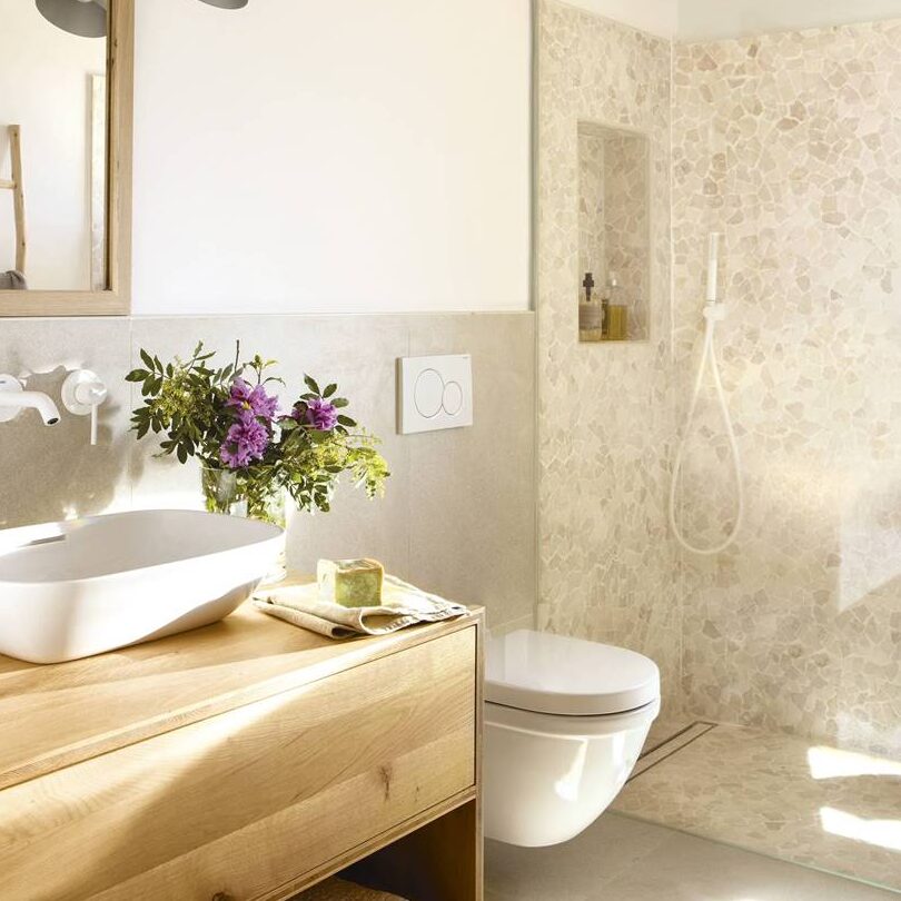 Los sanitarios suspendidos o con cisterna empotrada ahorran espacio visualmente. Los lavamanos pequeños, esquineros o de pared son perfectos. Considera un lavabo integrado en una encimera estrecha para un diseño limpio y funcional. La clave está en elegir elementos con proporciones adecuadas al tamaño del baño y que maximicen el espacio útil.