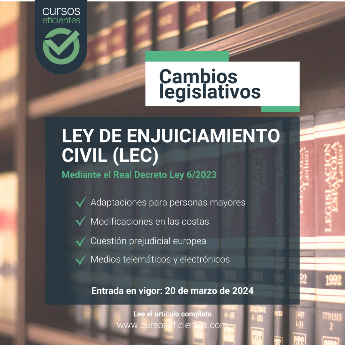La última reforma de la Ley de Enjuiciamiento Civil (LEC) que ha tenido un impacto significativo y generalizado entró en vigor el 20 de marzo de 2024. Esta reforma, introducida por la Ley 2/2024, de 15 de marzo, modificó diversos aspectos de la LEC con el objetivo de agilizar los procedimientos judiciales y adaptarlos a las nuevas realidades sociales y tecnológicas.